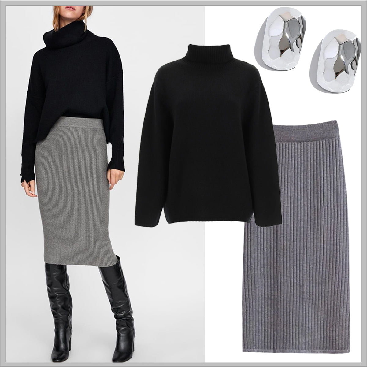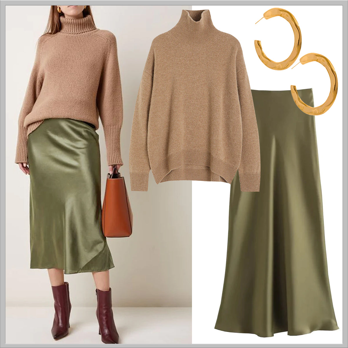 Σε γήινους τόνους, το σετ Ashton απευθύνεται σε εσάς που αγαπάτε τις ζεστές, απαλές αποχρώσεις. Δεξιόστροφα από πάνω: πουλόβερ ΜONCYE, σκουλαρίκια CARA EMERSON, φούστα DIANE FORD. Αποκτήστε όλο το σετ με έκπτωση 30%