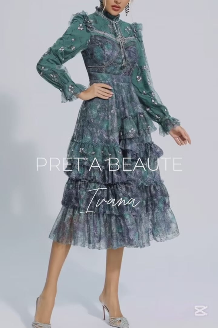 Ivana Petrol Floral Tulle Mesh Dress