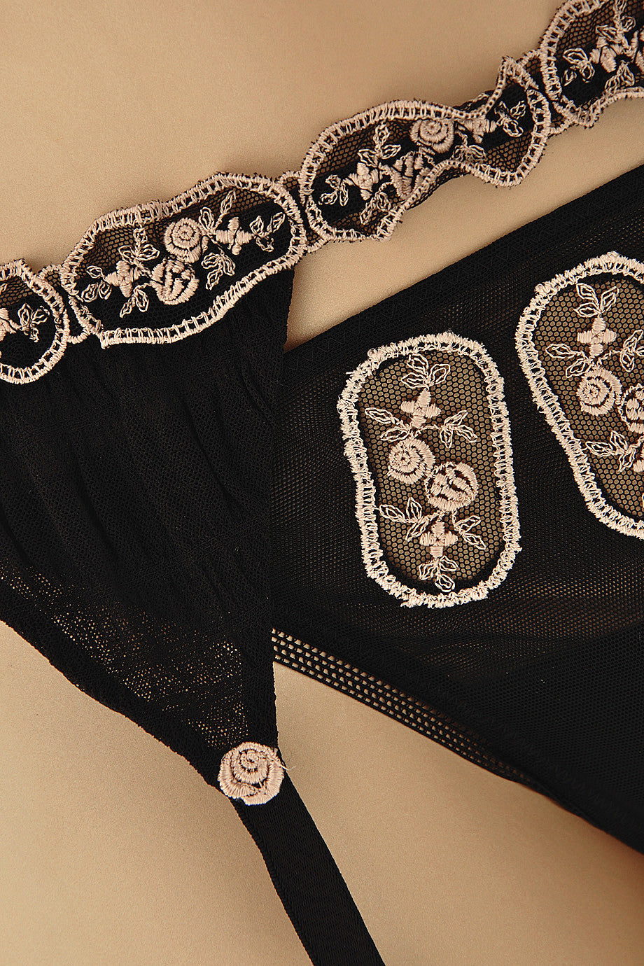 Impressive and sexy thong from La Perla. The ROSE Embroidered Black Thong has a black color, transparent mesh and is embroidered with a beige floral pattern.